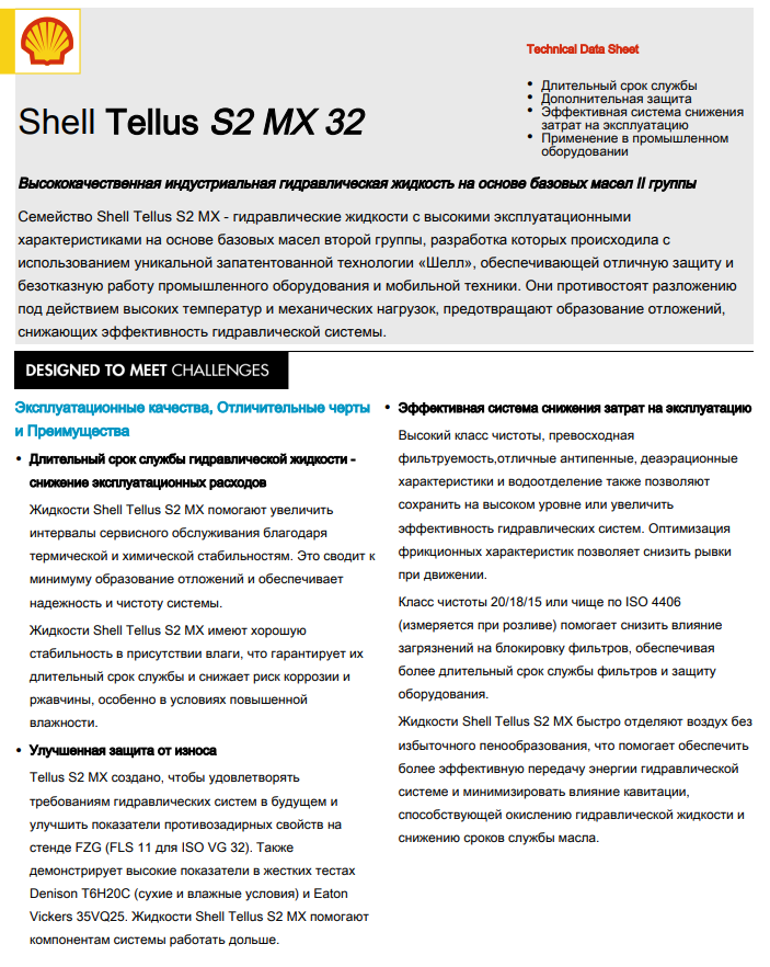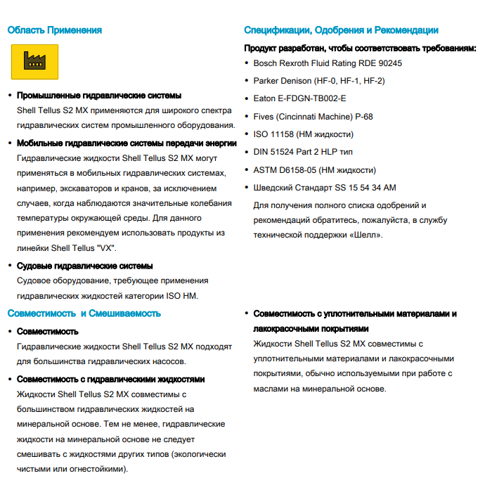DENISON Hydraulics HF-0, HF-1, HF-2, Cincinnati Machine P-68 (ISO 32), P-70 (ISO 46), P-69 (ISO 68), Eaton Vickers брошюра 694, ISO 11158 HM, AFNOR NF-E 48-603, ASTM 6158-05 (HM), DIN 51524 часть 2 тип HLP, Стандарт Швеции SS 15 54 34 AM, GB 111181-1-94 (HM), Bosch Rexroth RD 90220-01 (2011). Противоизносной присадкой в маслах Shell Tellus S2 M является дитиофосфат цинка, что ограничивает возможность их применения в системах, где используются детали из серебра. Для них рекомендуются масла Shell Tellus S3 M или Shell Morlina S2 B |